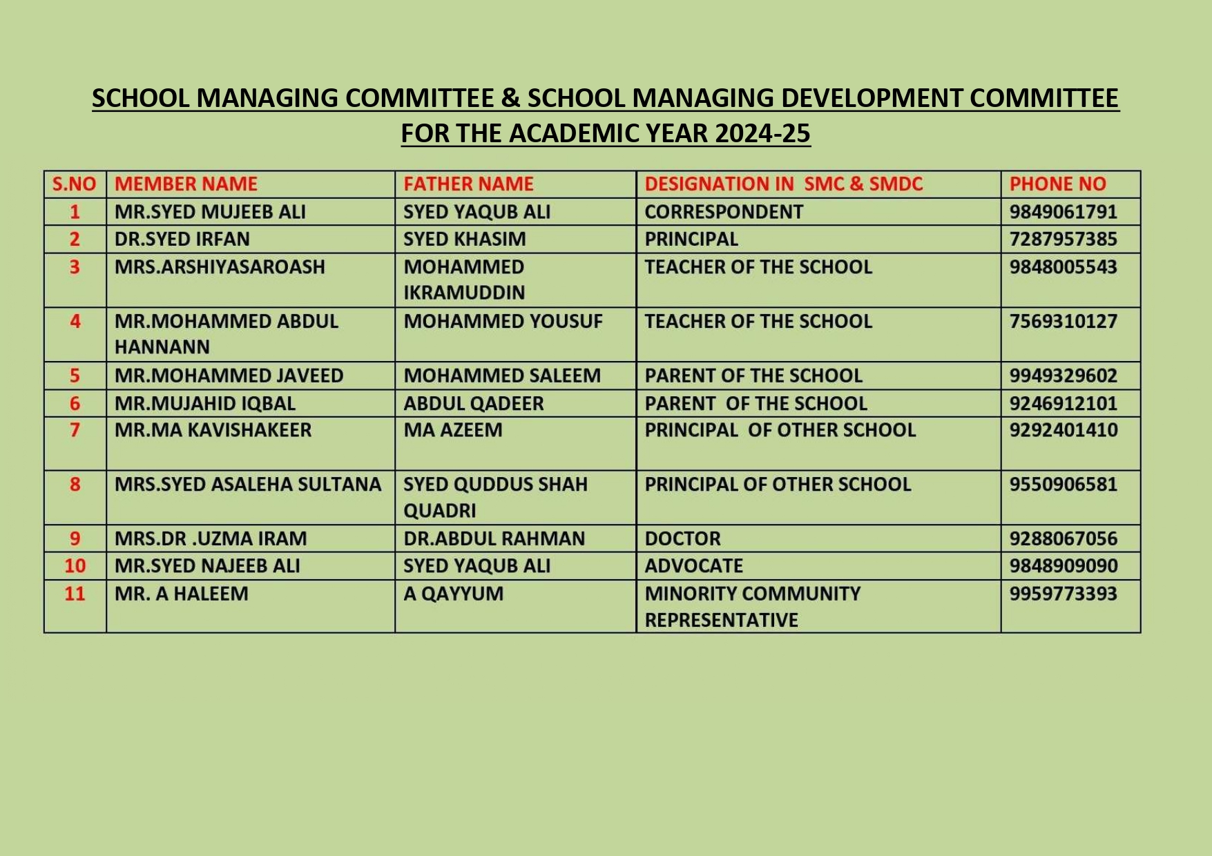 1 | PRINCIPAL | Dr.Syed Irfan / B.Sc(Micro-biology), B.Ed, MA(English), M.Sc(Chemistry), PhD(English Literature). |